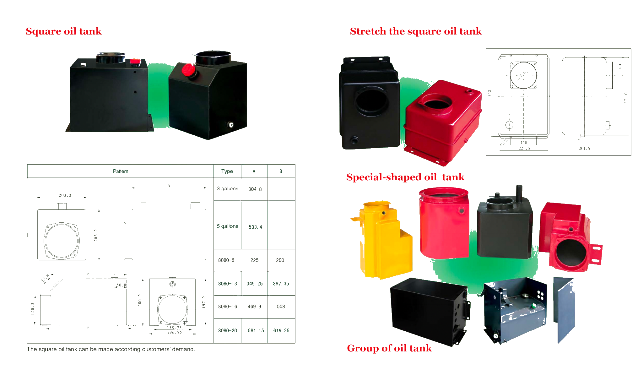 Our oil tank products come in a wide range of materials and sizes, and we can customize them to meet your specific needs. We offer various types, including side-mounted oil tanks, square oil tanks, stretch square oil tanks, and special-shaped oil tanks.